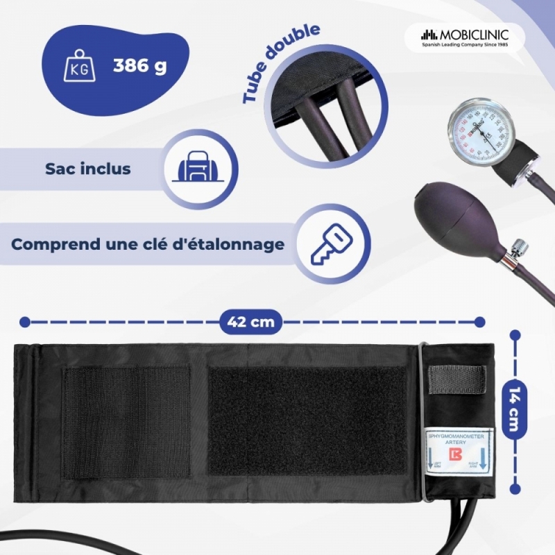 Le sphygmomanomètre anéroïde est utilisé par les professionnels de la santé pour mesurer la tension artérielle des patients. Ce modèle particulier est de type palmaire, composé d'une pompe en caoutchouc reliée à un brassard. Le sphygmomanomètre anéroïde est utilisé avec un stéthoscope pour écouter le pouls. Ce type de sphygmomanomètre est le plus utilisé par les professionnels de la santé en raison de sa grande fiabilité.