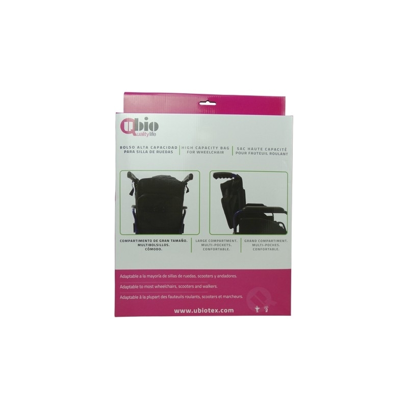 Sac pour fauteuil roulant de grande capacité avec plusieurs compartiments. Il dispose de 4 poches avec fermetures éclair. Réglable avec 2 sangles velcro.