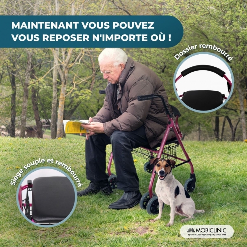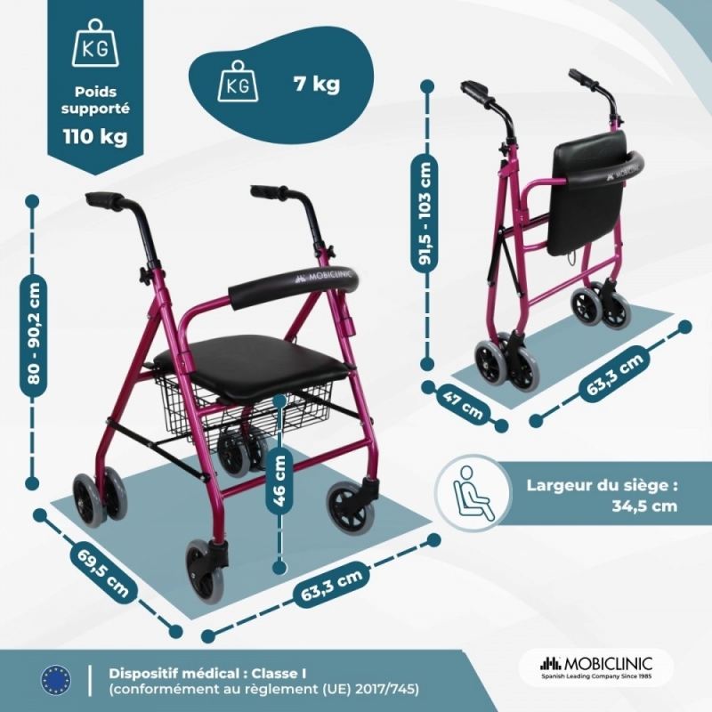 Déambulateur pliant | Siège et dossier | Aluminium | Panier | Pour personnes âgées | Rose | Prado | Mobiclinic
