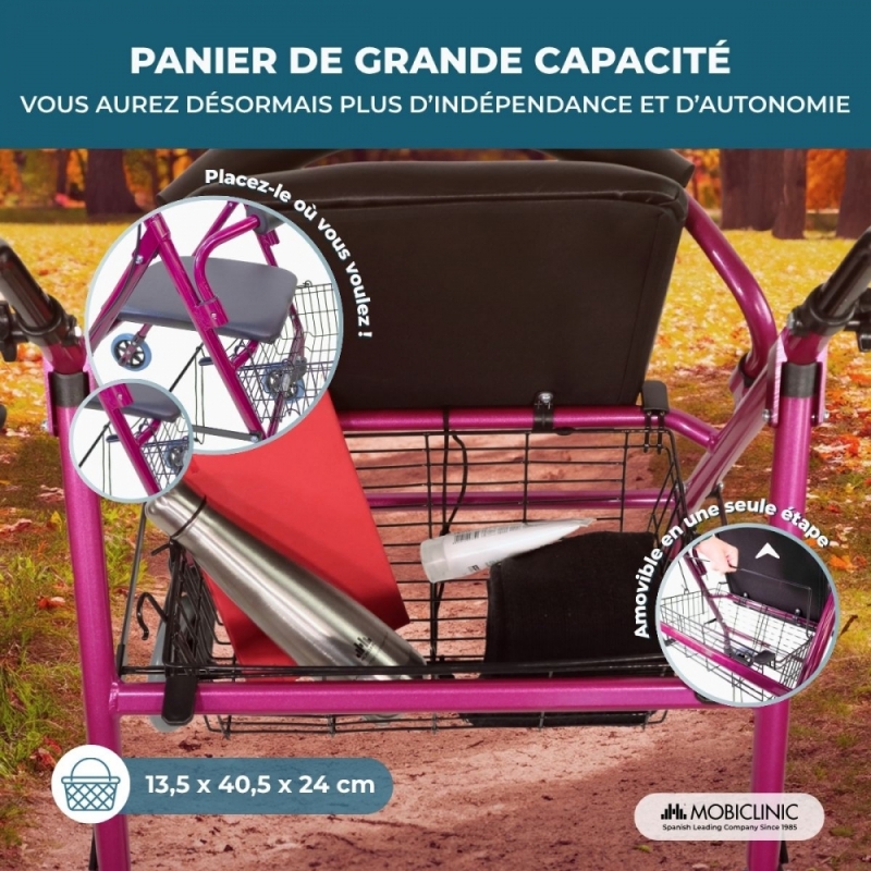 - Il dispose d'un panier à provisions qui peut être placé sous le siège ou à l'avant du déambulateur.