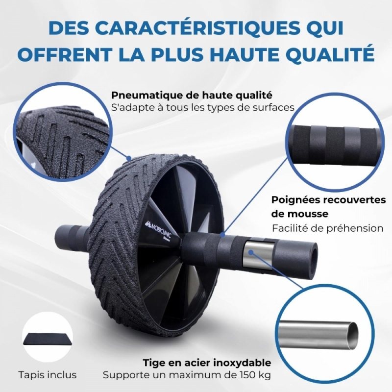 La structure de ce rouleau d'abdominaux est solide et robuste. Sa tige en acier inoxydable et ses pneus de qualité supérieure permettent à ce rouleau abdominal de fitness de supporter un poids maximal de 150 kg sans vaciller. De plus, ses tiges garantissent une prise en main qui rendra vos entraînements plus stables.