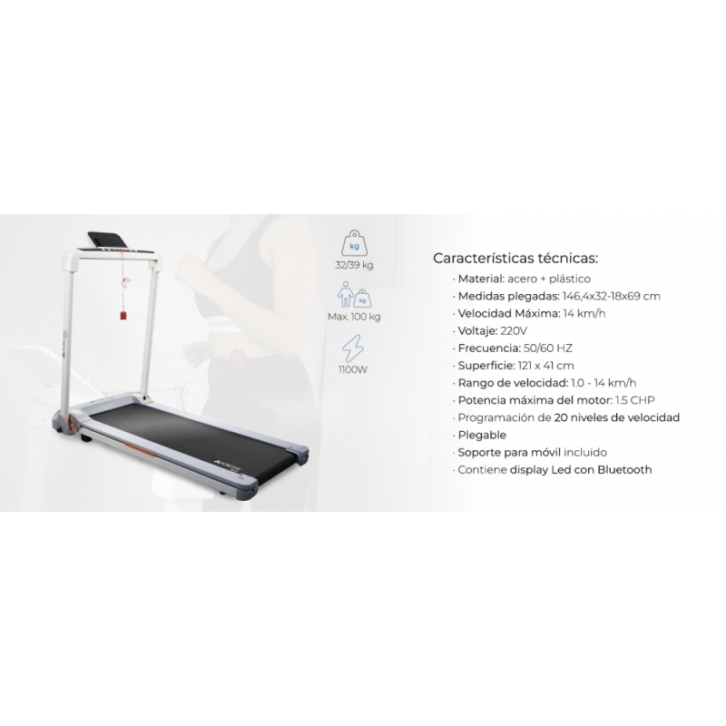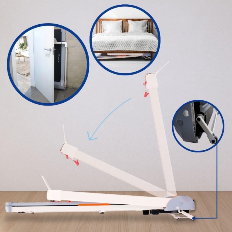 Le rangement et le transport de ce tapis de course pliable est très simple car grâce à ses petites dimensions et au fait qu'il soit pliable et doté de roues, il peut être rangé où vous voulez comme sous le lit, le canapé, etc. ou le transporter là où vous voulez faire l'exercice. La seule chose à garder à l'esprit lors du stockage de l'équipement est de le ranger dans un endroit fermé, à l'abri de la poussière et de l'humidité. De plus, le support du dispositif peut être facilement retiré à l'aide d'un tournevis si le stockage n'est pas possible.