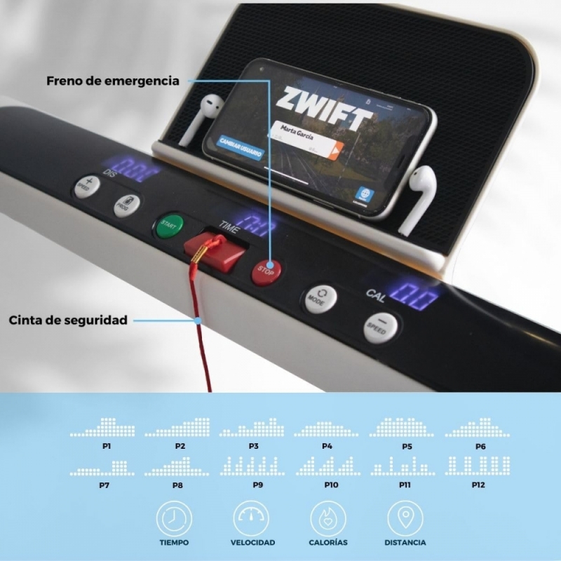 AVEC APPLICATION D'ENTRAÎNEMENT : le tapis roulant électrique Tibet peut être lié à des applications telles que Gfit, Zwift et SPAX qui permettent à l'utilisateur de suivre l'exercice de manière plus dynamique et divertissante. Avec ces applications, la combinaison du plaisir et de la formation vous aidera à atteindre vos objectifs avec une communauté qui vous motive à chaque minute. L'application Zwift est disponible en anglais, français, italien, allemand, espagnol, chinois et japonais, tandis que les deux autres ne sont disponibles qu'en anglais. De même, le tapis de course peut être utilisé sans l'application proposée car il dispose d'une barre LED avec 12 programmes d'entraînement.