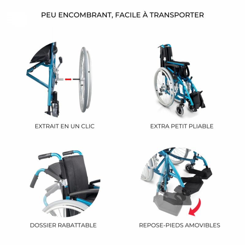 ROUES ARRIÈRE AMOVIBLES : Grâce à son système de dégagement rapide, vous pouvez retirer les roues arrière en appuyant sur un bouton, ce qui vous permet de transporter facilement la chaise et les roues séparément dans n'importe quelle voiture.