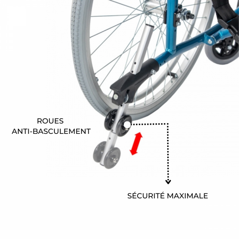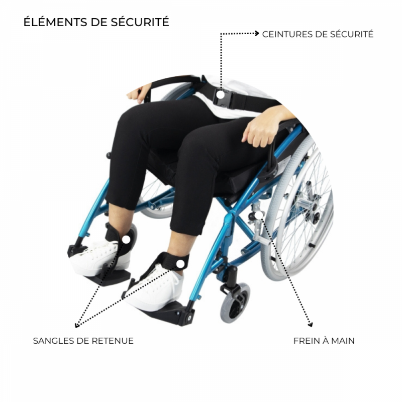 SÛR : Fauteuil roulant en aluminium, qui offre de meilleures garanties et une plus grande durabilité. Il dispose d'un système de roue arrière anti-roulis pour empêcher l'utilisateur de tomber en arrière. Comprend une ceinture réglable à dégagement rapide pour plus de sécurité.