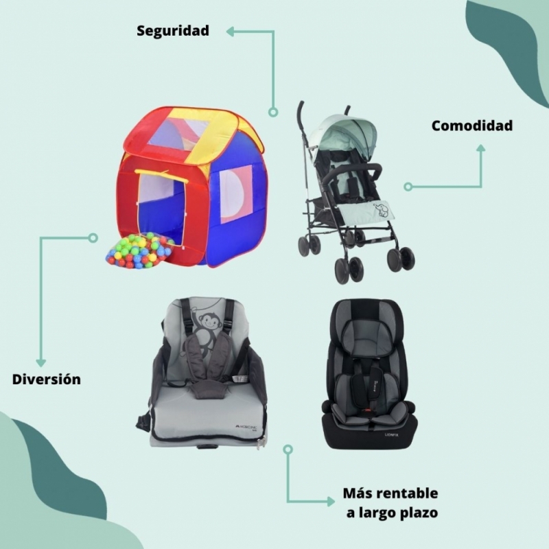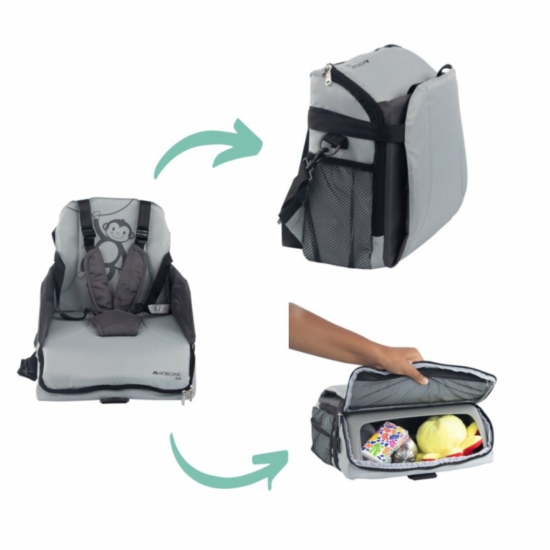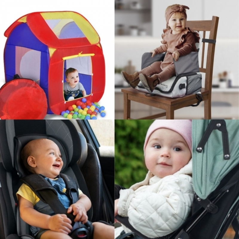 - Chaise haute de voyage : elle est portable et pliable. Elle dispose d'un compartiment pour ranger les biberons, les couches, etc.