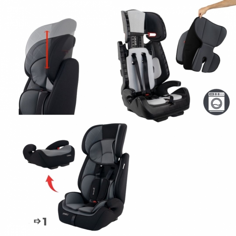 - Siège auto pour bébé Isofix : siège auto homologué et pliable avec appui-tête réglable, dossier amovible et harnais à 5 points qui maintient l'enfant en place.