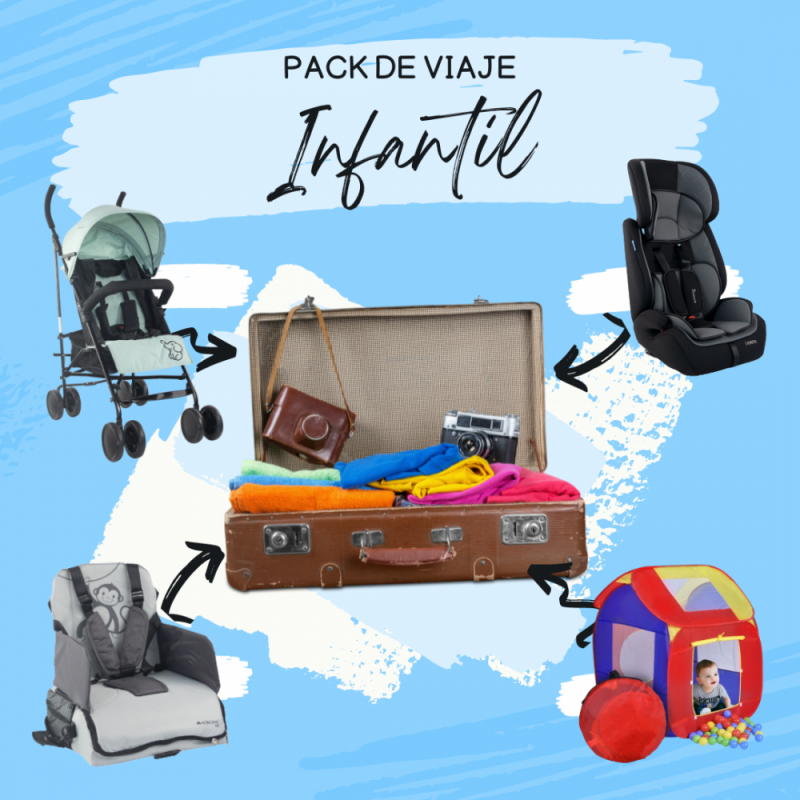 CE PACK CONTIENT : la tente de jeu pour enfants, la poussette pliable, la chaise haute de voyage légère et le siège auto bébé Isofix