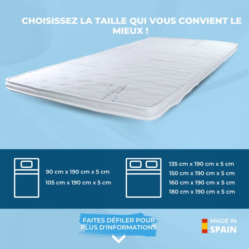 Donnez à votre matelas la touche qui lui manque ! Avec ce surmatelas vous pouvez donner une chance à votre matelas soit parce qu'il est trop dur, sans perdre en fermeté (grâce aux fibres naturelles) soit trop mou, en gagnant en confort . Continuez à profiter de votre matelas dans les résidences secondaires, dans votre maison de location ou pour les lits de maison de vacances. Le sur-matelas peut également être utilisé pour gagner en confort sur le canapé-lit ou pour joindre deux matelas pour obtenir un lit plus grand, par exemple, pour une chambre d'amis.