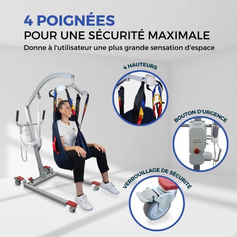SÉCURITÉ ACCRUE : Réduit les risques de blessures ou de chutes pour le patient et le soignant. Il est équipé d'un crochet permettant de maintenir le patient pendant les transferts et d'assurer sa stabilité. Il est également équipé d'un bouton d'arrêt d'urgence permettant de lever ou d'abaisser manuellement le patient si nécessaire.