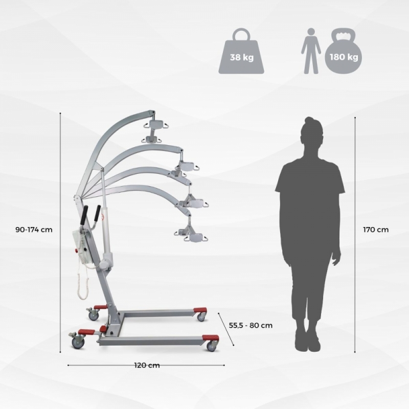 CAPACITÉ : Ce lève-personne orthopédique supporte un poids maximal de 180 kg. Sa distance de levage est de 90 à 174 cm. Son rayon de braquage est de 127 cm, tandis que le bras pivote à environ 180 °. Il peut descendre jusqu'à une hauteur d'environ 20 à 30 cm du sol.