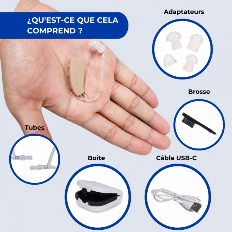 L' amplificateur EarPlus dispose également d'une autonomie longue durée, environ 20 et 24 heures, ce qui permet de l'utiliser au quotidien grâce à son temps de charge de seulement 2 heures. Vous pouvez charger votre appareil pendant que vous vous reposez la nuit ! Parmi ses accessoires, il comprend une série de pièces de rechange ou d'adaptateurs, un câble USB, un étui de protection et une brosse de nettoyage pour assurer son hygiène.