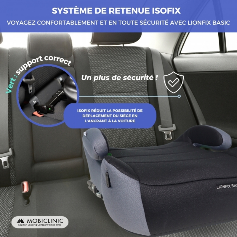 Avec Lionfix Basic vous aurez toutes les garanties de sécurité au premier plan grâce à son système IsoFix. Il s'agit d'un type d'ancrage facile à installer et qui permet de fixer rapidement le système de retenue pour enfants directement sur le châssis du véhicule, ce qui offre une plus grande stabilité et réduit le risque de coup du lapin en cas de choc frontal avec ce pont élévateur.