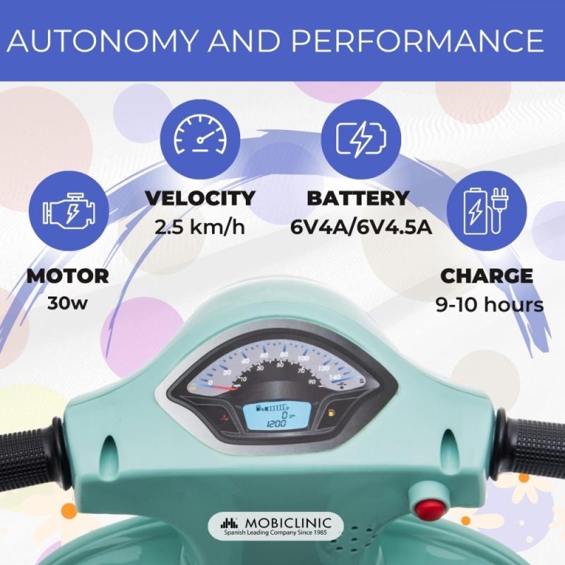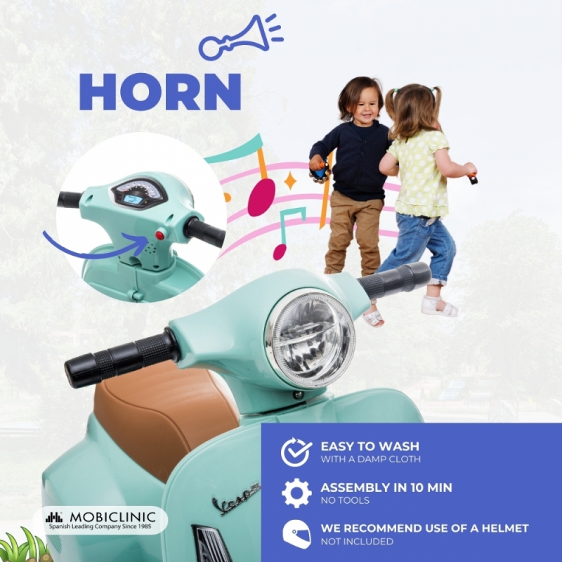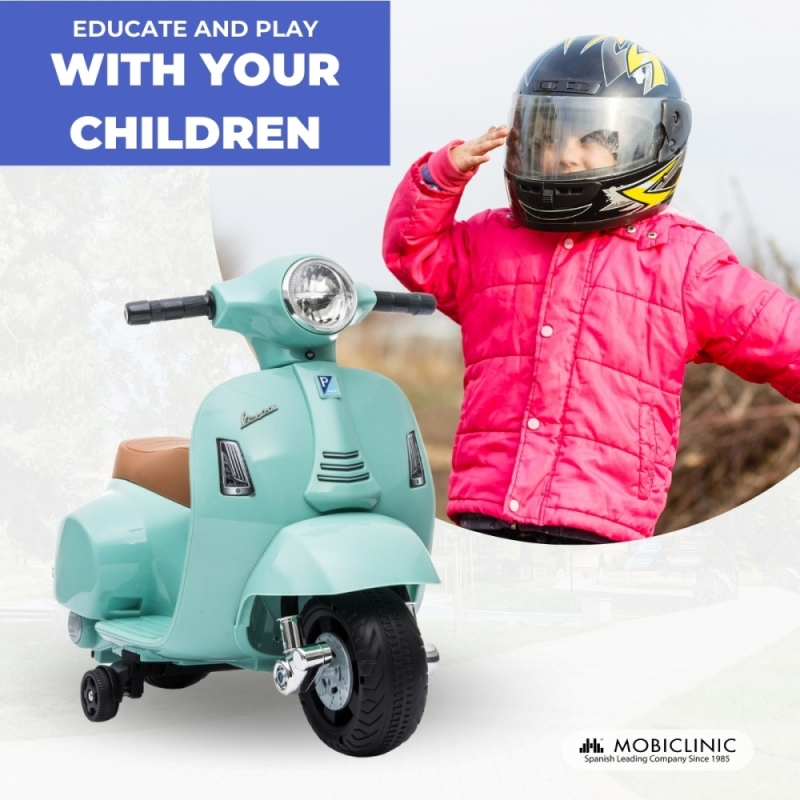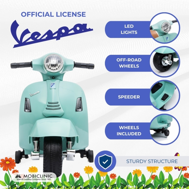 Moto électrique pour enfants | Vespa Piaggio | Anti-renversement | Moteur 30W | 2,5 km/h | Effet musical | Rome | Mobiclinic