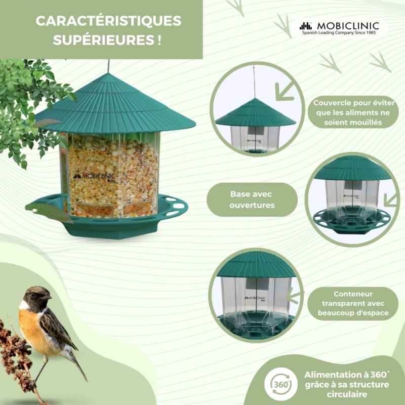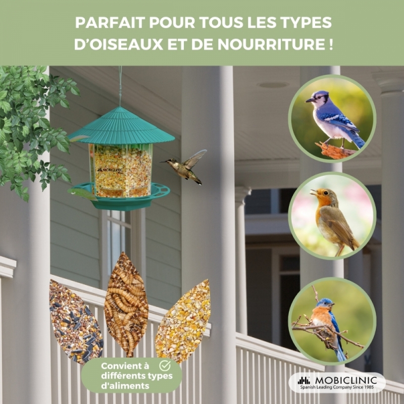 Cette mangeoire à oiseaux ne se limite pas à être un distributeur de nourriture ; C'est également une charmante attraction qui attire une grande variété d'espèces d'oiseaux . Il offre une expérience unique d'observation des oiseaux, favorisant ainsi la diversité et encourageant la faune locale . Profitez de la vue sur les oiseaux qui viennent chez vous, rapprochez-vous de la nature et de la vie des oiseaux