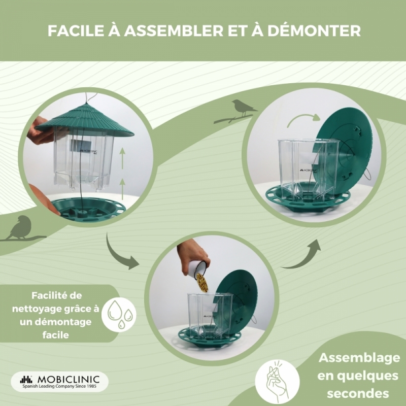 ENTRETIEN FACILE : Conçu avec des plastiques PP (polypropylène) et PS (polystyrène) résistants, il permet un nettoyage rapide , gardant vos visiteurs ailés heureux et en bonne santé. Facile à remplir et à nettoyer grâce à son couvercle à grande ouverture avec verrou tournant . Le chargeur en plastique transparent vous aide à savoir quand le remplir. Pour le remplissage, il suffit de tourner pour déverrouiller, d'ouvrir le couvercle et d'y verser les graines.