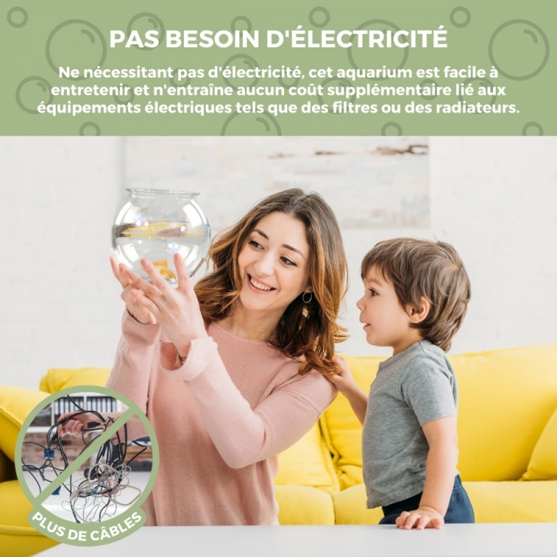 Cet aquarium ne nécessite pas d'électricité, ce qui le rend facile à entretenir sans frais supplémentaires . Sa légèreté le rend facile à transporter, ce qui le rend parfait pour ceux qui ont besoin de le déplacer d'un endroit à un autre. De plus, après décoration, il devient une pièce esthétique, ajoutant une touche décorative à l'environnement.
