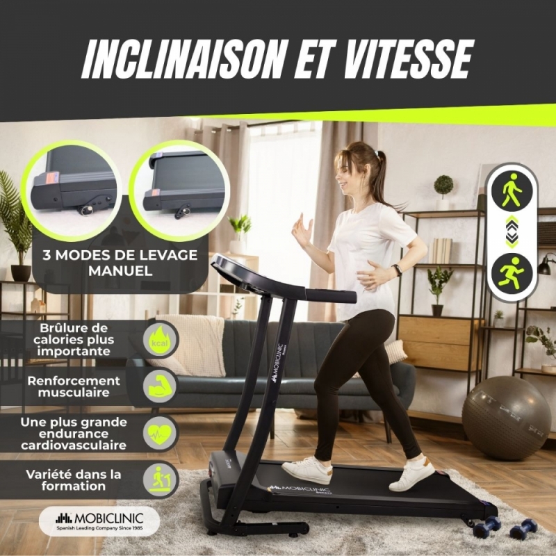 La personnalisation est la clé de l'approche du tapis roulant Etna en matière de fitness. Avec 3 modes de levage manuels (ajustables sur la face inférieure du tapis roulant) et 12 programmes d'entraînement prédéfinis , il vous permet d'adapter l'intensité de l'exercice pour vous concentrer sur la combustion de calories, le renforcement musculaire ou l'amélioration de l'endurance cardiovasculaire. La possibilité d' ajuster l'inclinaison offre de la variété dans votre routine d'entraînement, aidant à éviter un plateau et à maintenir l'intérêt au fil du temps.
