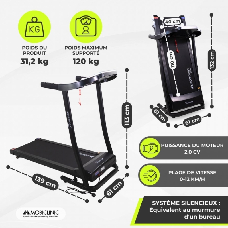 PLIAGE ULTRA-COMPACT, ROULETTES ET FONCTIONNEMENT SILENCIEUX : Le tapis de marche Etna se range très facilement grâce à sa petite taille et son mécanisme de pliage ultra-compact. Vous pouvez le ranger où vous le souhaitez, sous un lit, un canapé, etc. Ses roulettes facilitent son transport et son fonctionnement est tout aussi silencieux. Son niveau sonore est inférieur à 60 dB, soit l’équivalent d’un murmure de bureau.