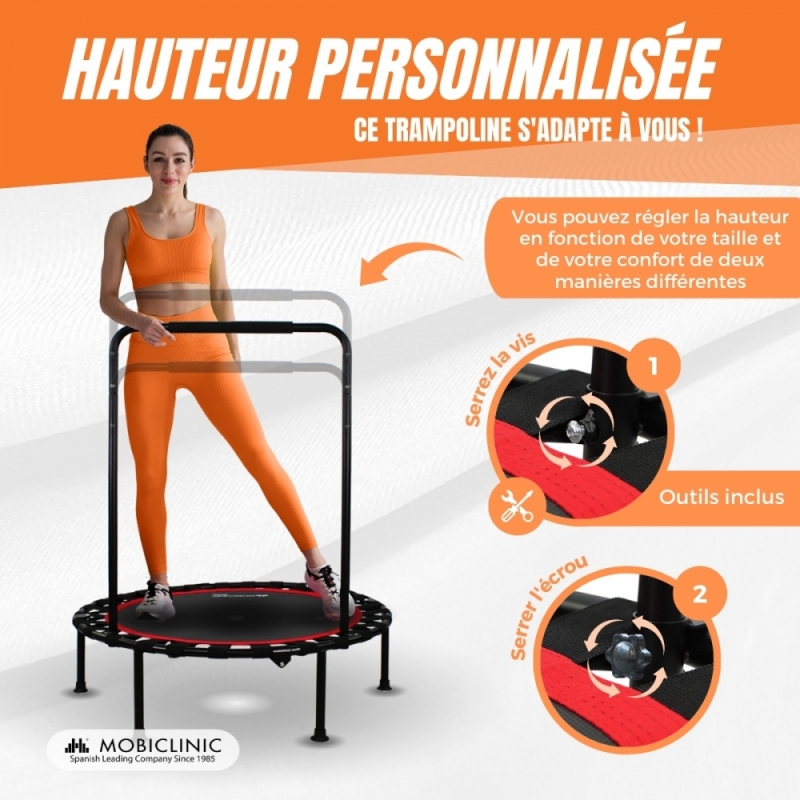 ACCOUDOIR À HAUTEUR RÉGLABLE : Le trampoline rond Kangumobi convient à tous les âges car il s'adapte à la taille de l'utilisateur ! Il a une plage de hauteur personnalisable et réglable de 92 à 118 cm , s'adaptant au goût du consommateur. Il peut être réglé si l'on place les vis à fleurs, si l'on utilise les vis classiques l'accoudoir sera fixé bien qu'avec celles-ci on puisse régler la hauteur à l'aide d'une clé allen.