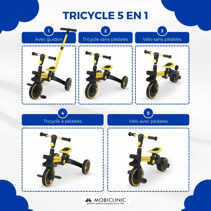 Tricycle 5 en 1 | Convertible | Réglable | Max 25 kg | Léger | 1,5-5 ans | Jaune | Chase | Mobiclinic