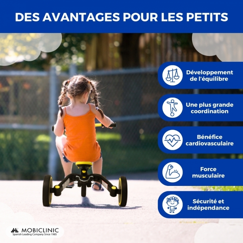 - Son adaptabilité et sa polyvalence : ses pièces réglables et amovibles offrent un tricycle qui se transforme en vélo à mesure que l'enfant grandit.