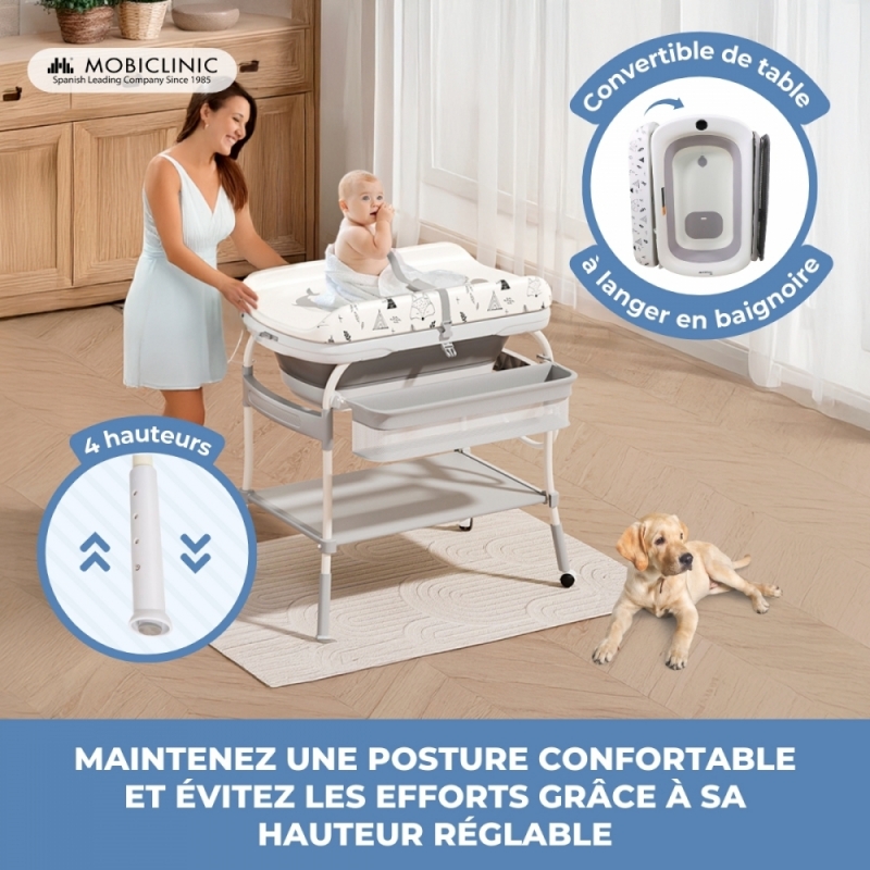 CONFORT ET ERGONOMIE : La hauteur réglable sur quatre positions (86, 89, 92 et 95 cm) permet d'adapter la table à langer aux besoins des parents, réduisant ainsi la tension sur le dos lors du bain ou du change du bébé, offrant ainsi un confort plus grand. expérience.