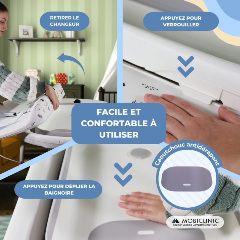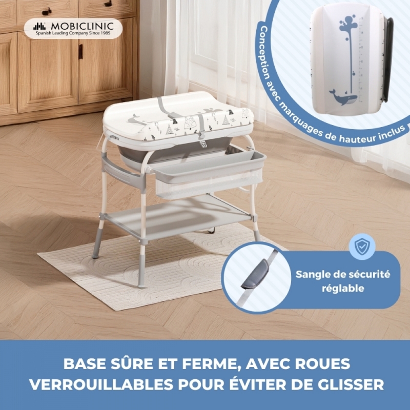 SÉCURITÉ ET STABILITÉ : La structure à angles droits et la ceinture de sécurité assurent une stabilité totale pendant l'utilisation, gardant le bébé en sécurité à tout moment, aussi bien pendant le bain que pendant le changement des couches.