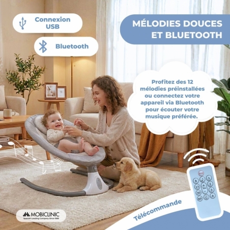 Fonctionnalités pratiques pour les parents : La balancelle pour bébé est équipée d’une télécommande permettant de régler facilement les paramètres sans avoir à se lever. Les parents peuvent ainsi contrôler à distance la vitesse du balancement, diffuser de la musique ou activer la minuterie, ce qui est particulièrement utile lorsque bébé dort déjà ou lorsque les parents sont occupés.