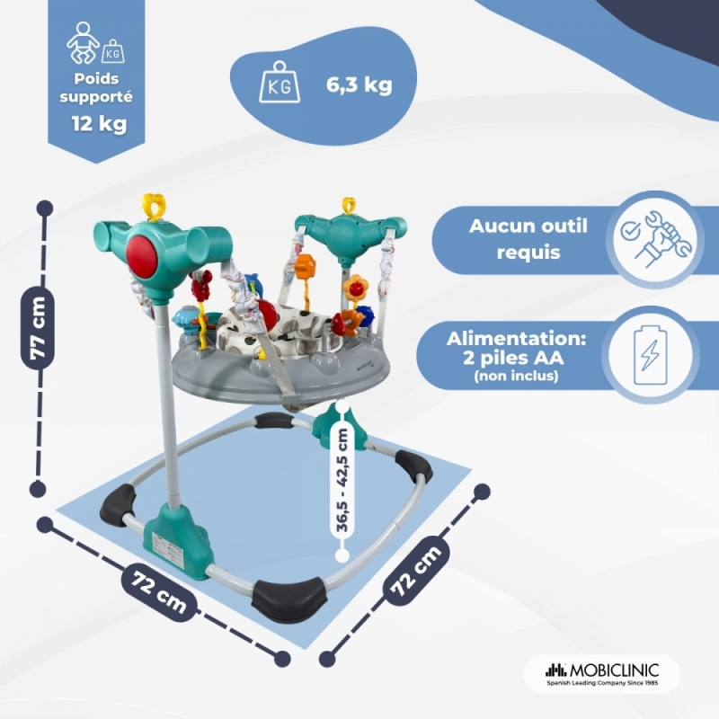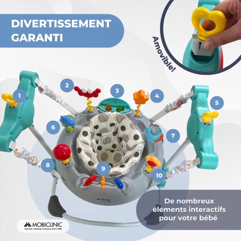 Ce sauteur pour bébé est parfait pour le développement et le divertissement des plus petits. Il allie apprentissage et plaisir, offrant 8 jouets interactifs qui stimulent la motricité fine et dispose également de 7 chansons et lumières intégrées qui aident au développement des sens.
