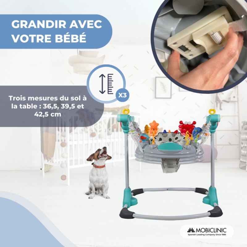 HAUTEUR RÉGLABLE : Le sauteur bébé grandit avec bébé grâce à ses 3 hauteurs réglables, permettant une utilisation prolongée du produit et s'adaptant à ses besoins et à chaque étape de sa croissance. Il garantit également que votre tout-petit ait une posture bonne et sûre pendant qu'il joue.