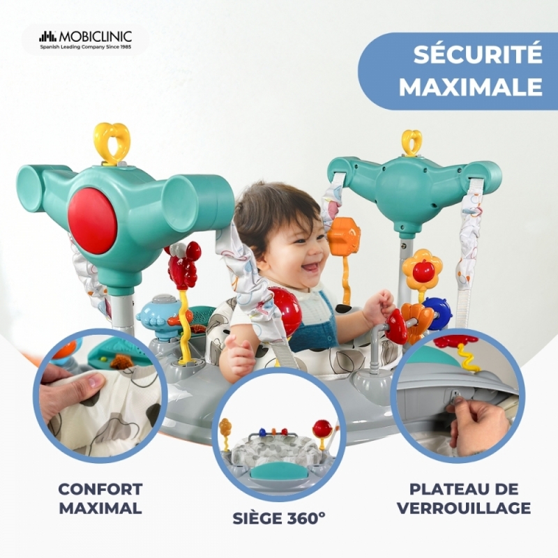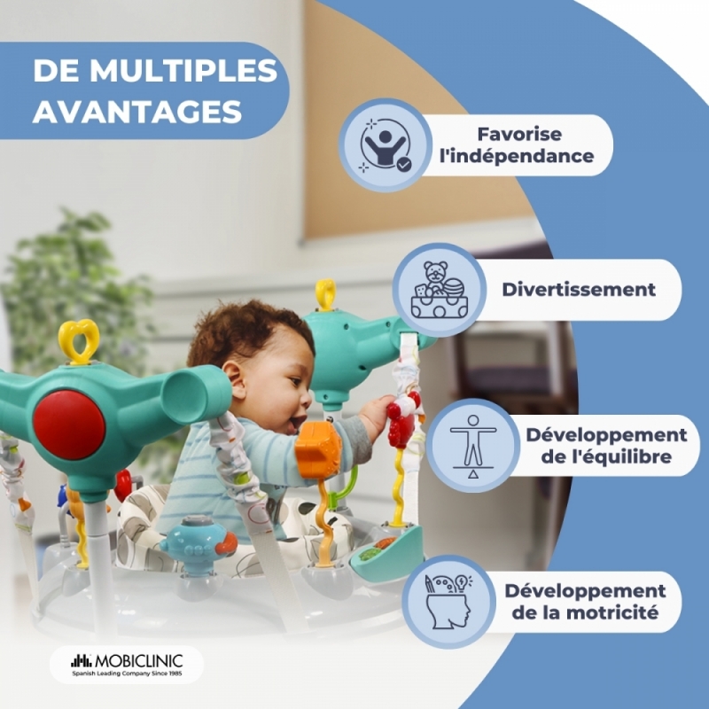 Il dispose de 3 hauteurs réglables qui permettent au sauteur d'accompagner bébé pendant sa croissance, en s'adaptant à ses besoins et à ses différentes étapes. De plus, cela garantit que le bébé maintient une posture correcte et sûre pendant le jeu. Son siège pivote à 360º, offrant au bébé la possibilité d'explorer complètement son environnement et sous n'importe quel angle, favorisant ainsi la coordination motrice.