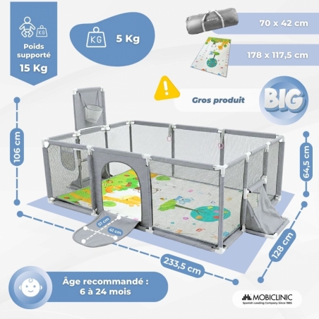 Grâce à ses dimensions de 128 x 233 cm, il offre un espace de jeu spacieux et confortable où les petits peuvent ramper, se tenir debout, jouer ou faire leurs premiers pas en toute sécurité. Le tapis inclus offre également une surface rembourrée qui isole le sol et favorise le jeu ou le repos.