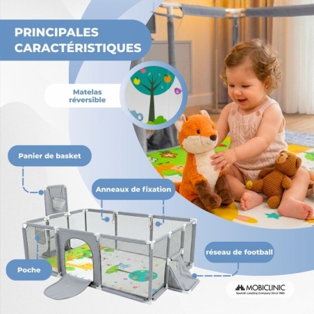 L'aire de jeux Kidland est un espace alliant jeu, développement et divertissement pour les tout-petits. Son design multifonctionnel, avec son panier de basket et son filet de football intégrés, encourage l'activité physique dès l'âge de 6 mois.