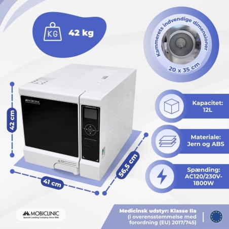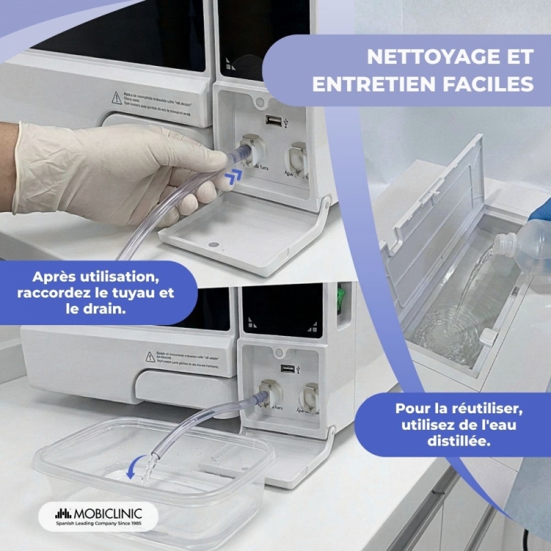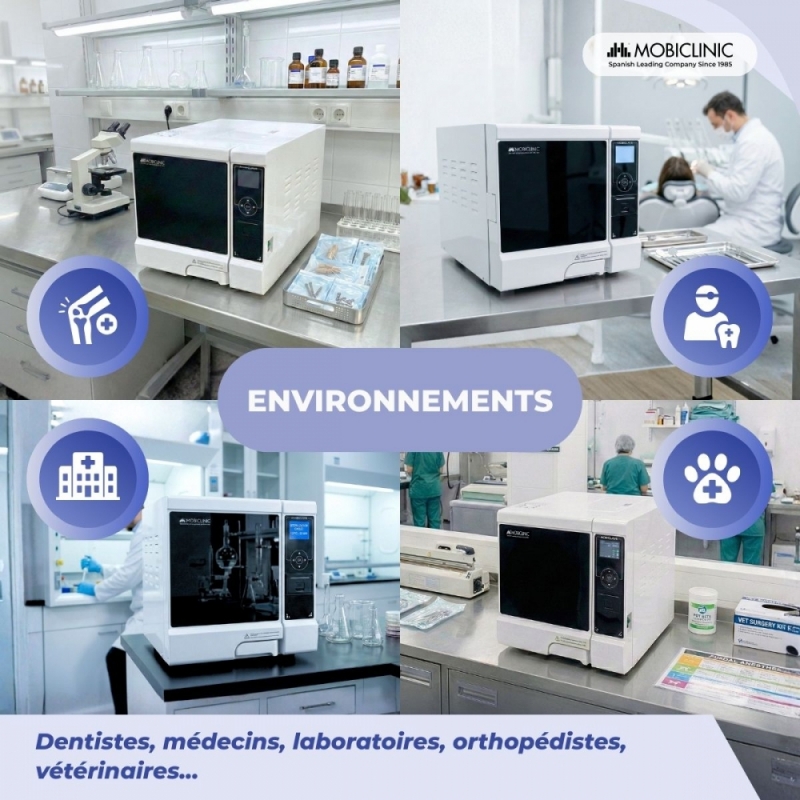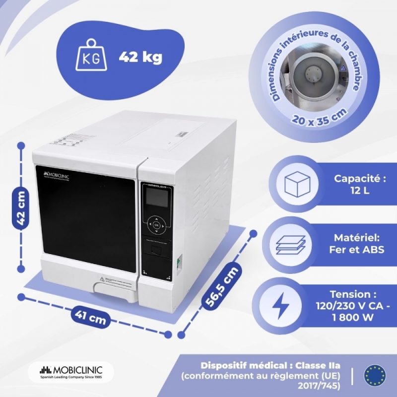 L' autoclave stérilisant de 12 litres Mobiclinic est une solution professionnelle offrant une stérilisation complète, efficace et sûre , conçue pour tous les types d'environnements cliniques. Il utilise de la vapeur saturée à 99 % pour inactiver les bactéries, les virus, les champignons et les spores , garantissant ainsi un processus de nettoyage fiable même dans les environnements les plus exigeants.