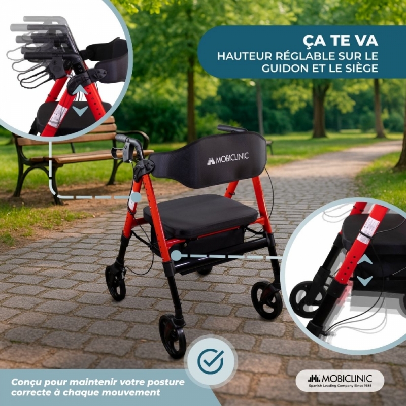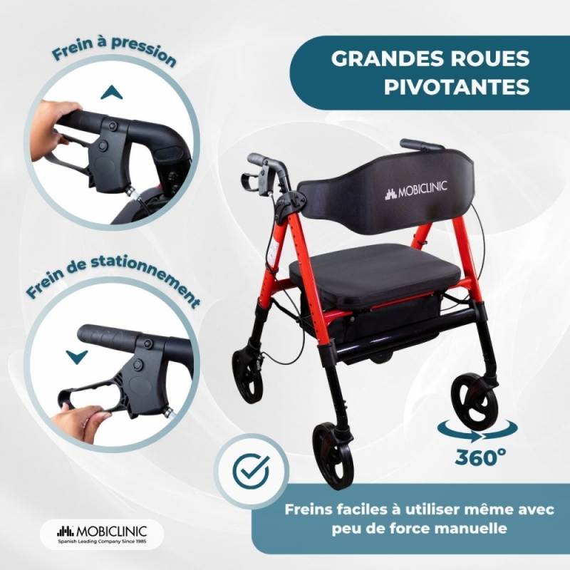 Le système de pliage est simple et rapide : il suffit d'actionner la barre sous le siège pour compacter le déambulateur et le transporter ou le ranger sans effort. Ses roues avant pivotantes à 360 degrés de 20 cm offrent une grande maniabilité, tandis que les roues amovibles permettent un rangement peu encombrant.