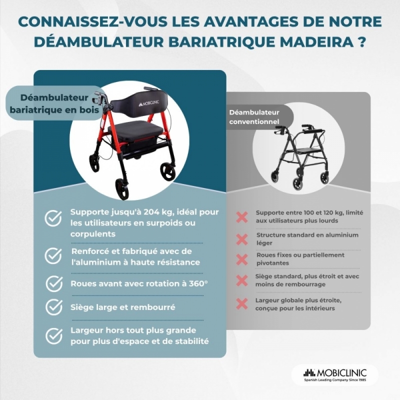 Le déambulateur bariatrique Madeira Mobiclinic est conçu pour offrir un maximum de stabilité, de robustesse et de confort . Avec une capacité de charge allant jusqu'à 204 kg , il dépasse largement les modèles standard (100-120 kg), ce qui le rend idéal pour les personnes en surpoids ou recherchant une plus grande sécurité lors de leurs déplacements.