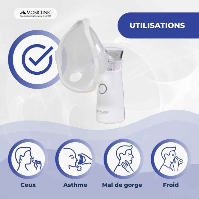 EFFICACE ET SÉCURITAIRE : Cet appareil est indiqué pour le traitement des maladies respiratoires telles que l'asthme, la BPCO, la bronchite et d'autres affections pulmonaires. Il offre une nébulisation constante à une vitesse inférieure à 0,2 ml/min, optimisant l'administration du médicament et favorisant une inhalation confortable et aisée.