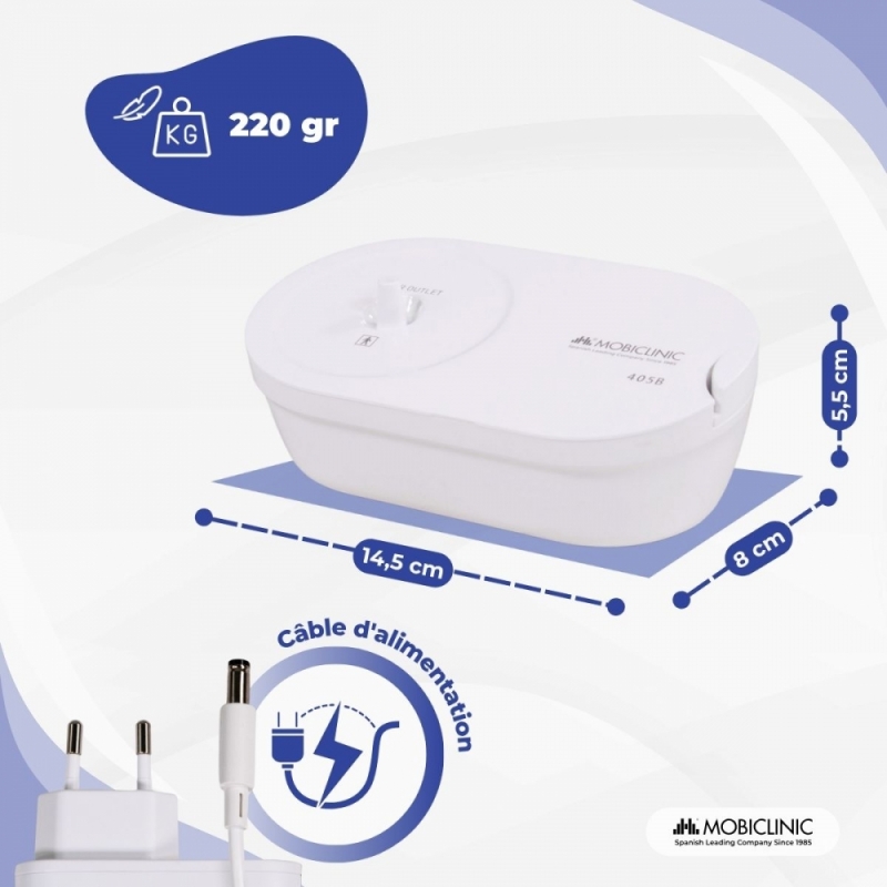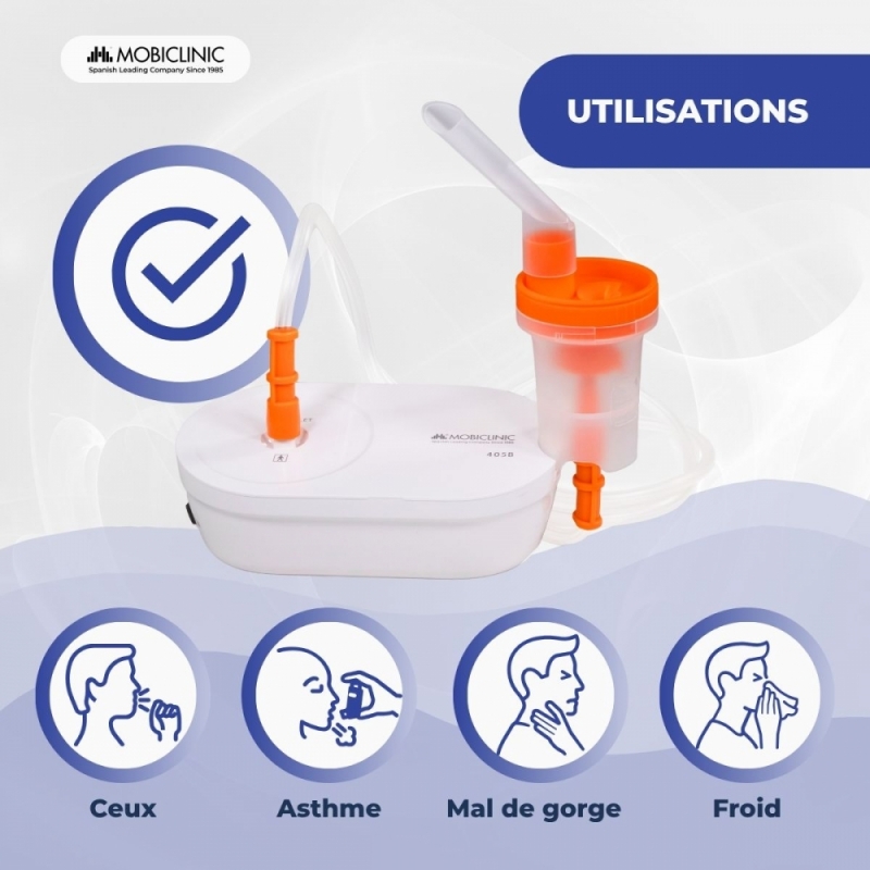 Sa conception compacte et légère le rend facile à ranger et à transporter. Son fonctionnement est simple : il se connecte au réseau via USB. Côté hygiène, ses pièces sont faciles à démonter, ce qui facilite le nettoyage. Le gobelet doseur et l'embout buccal se désinfectent par ébullition, tandis que les masques peuvent être désinfectés à l'alcool. Le tuyau à air doit simplement être rincé et séché avec un chiffon.