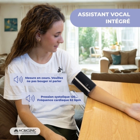 ASSISTANT VOCAL : Un guide vocal décrit l’intégralité du processus de mesure étape par étape. Cette fonctionnalité facilite l’utilisation, notamment pour les personnes âgées ou malvoyantes, en rendant l’expérience plus intuitive. Elle est disponible en anglais et en espagnol.
