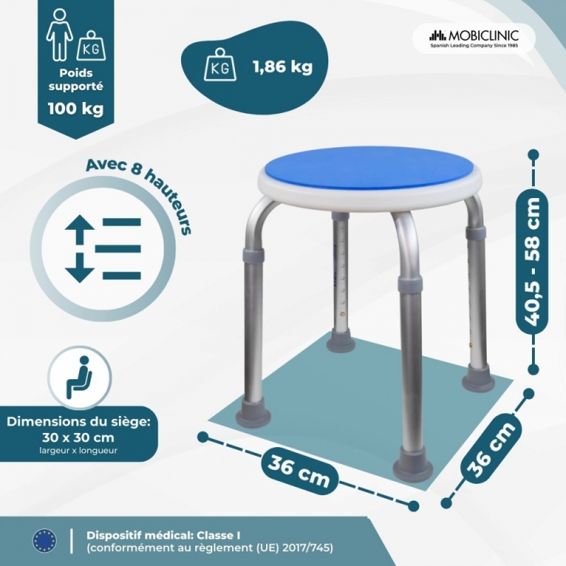 RÉGLAGE RAPIDE ET PRÉCIS : Ce tabouret de douche est doté d'un système à bouton-poussoir pour un réglage facile et sans outil de la hauteur. Il offre 8 positions pour s'adapter aux différents besoins de l'utilisateur.