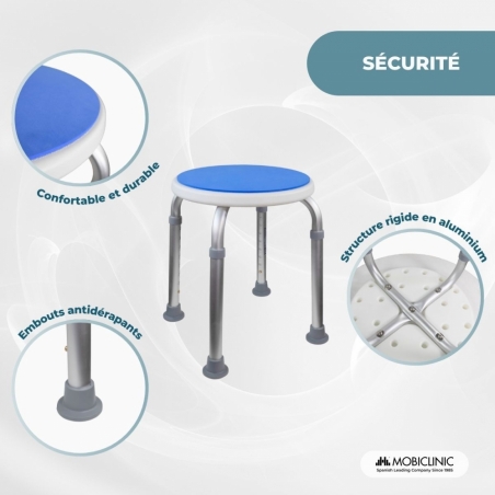 STABLE ET RÉSISTANT : Le cadre en aluminium de ce tabouret de bain résiste à une utilisation continue en milieu humide et à la corrosion et à la rouille. Il est également doté d'embouts antidérapants qui améliorent l'adhérence sur sol mouillé et réduisent les risques de chute.