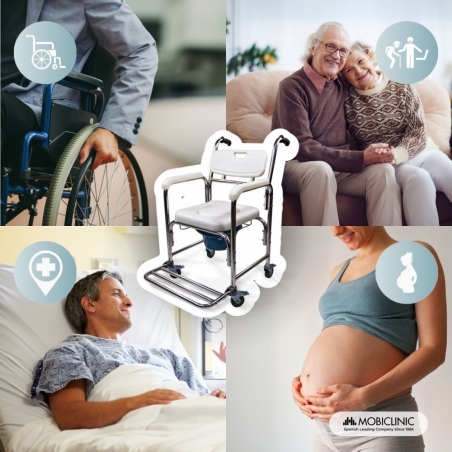 Polyvalente, elle peut servir de chaise percée, de chaise de douche, de rehausseur de toilettes et de chaise de transfert, s'adaptant ainsi aux besoins de tous les utilisateurs. Elle est équipée de freins sur ses quatre roues pour plus de sécurité et pour éviter tout déplacement involontaire.