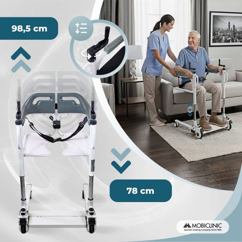 Il est doté d'un double système de sécurité, comprenant une ceinture arrière réglable qui maintient fermement l'utilisateur et un mécanisme de verrouillage automatique du cadre. Il possède également des freins de blocage sur les quatre roues pour une meilleure stabilité lors des transferts, empêchant tout mouvement involontaire.
