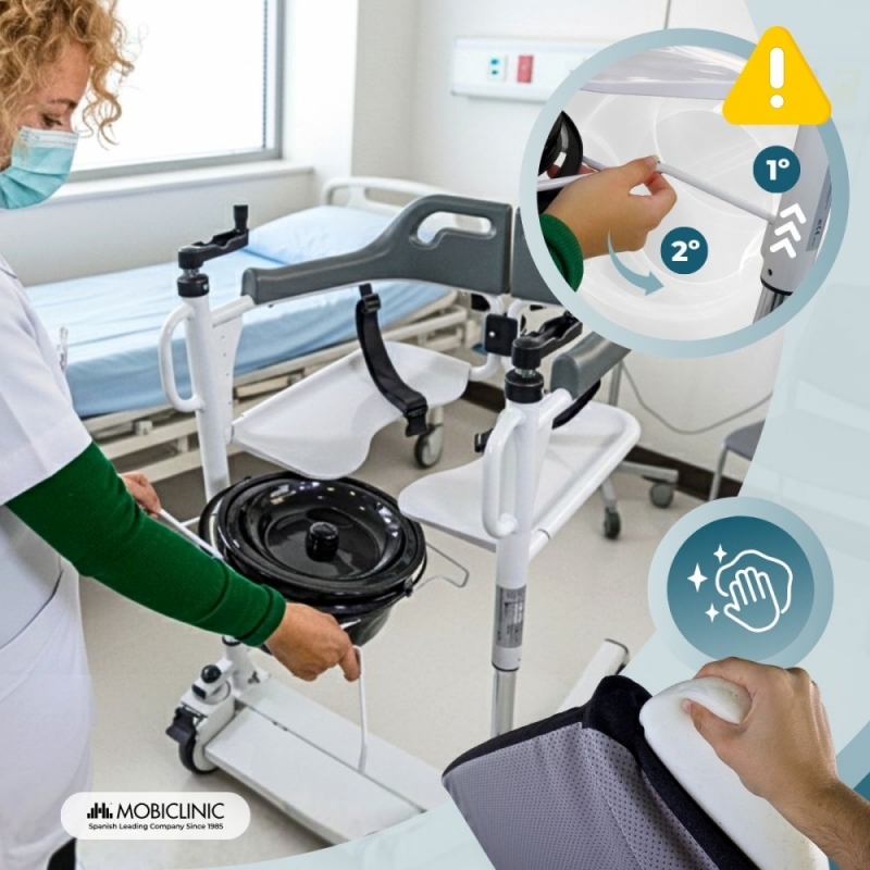 Son large mécanisme d'ouverture et de fermeture rapide facilite l'installation de l'utilisateur et réduit l'effort physique du soignant. Il comprend également un coussin rembourré amovible et lavable, idéal pour une hygiène optimale, et un plateau de toilette amovible, transformant ainsi le fauteuil en toilettes portables pratiques et fonctionnelles. IMPORTANT : Retirez la structure métallique et le plateau avant d'ouvrir le cadre du fauteuil.