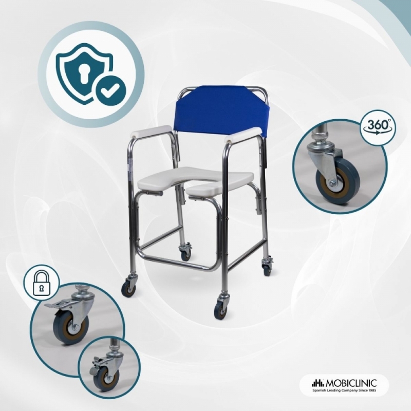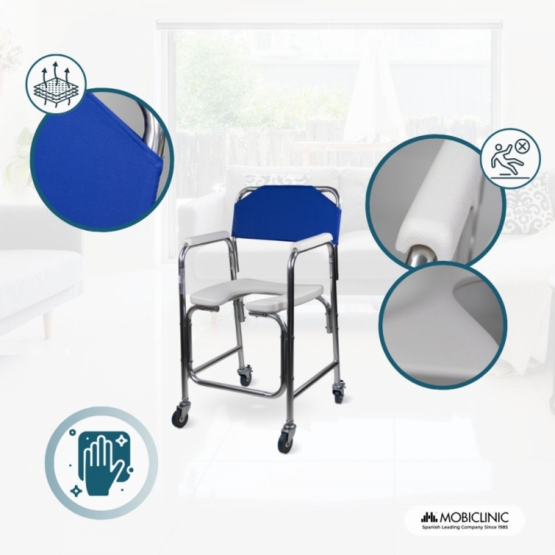 La chaise percée à roulettes dispose d’accoudoirs rembourrés confortables.