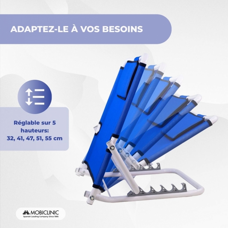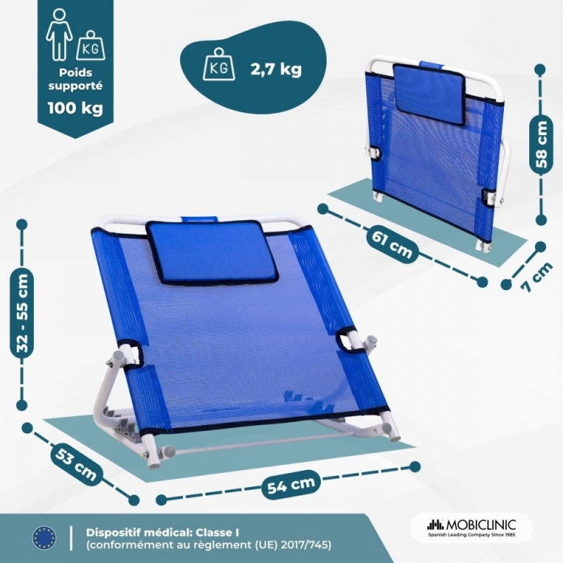 Il s'agit d'un relève-buste appui dos réglable qui offre une inclinaison de 45º à 60º, permettant ainsi aux personnes alitées d'effectuer leurs activités quotidiennes.
