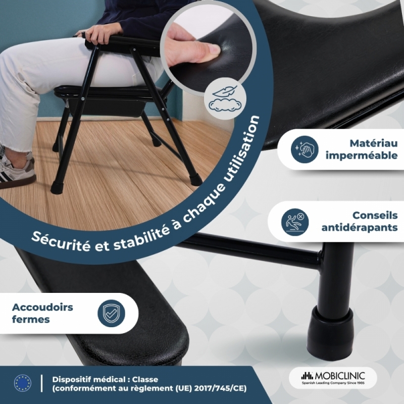La chaise percée Guadalquivir est idéale pour les personnes qui ont des difficultés d'accès aux toilettes ou des problèmes de mobilité. Cette chaise percée pliante les aidera dans leur quotidien et les soulagera dans des moments aussi importants que celui d'aller aux toilettes. Sa capacité est de 5 litres.