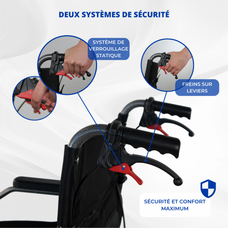 - Sa légèreté : fauteuil léger très maniable tant pour l'utilisateur que pour les accompagnateurs, grâce à son matériau de fabrication.