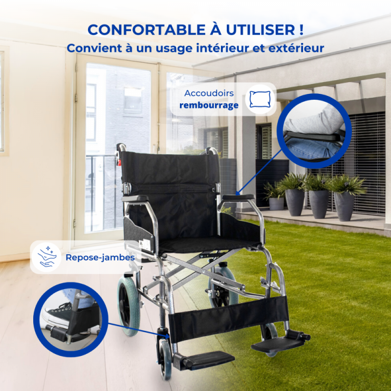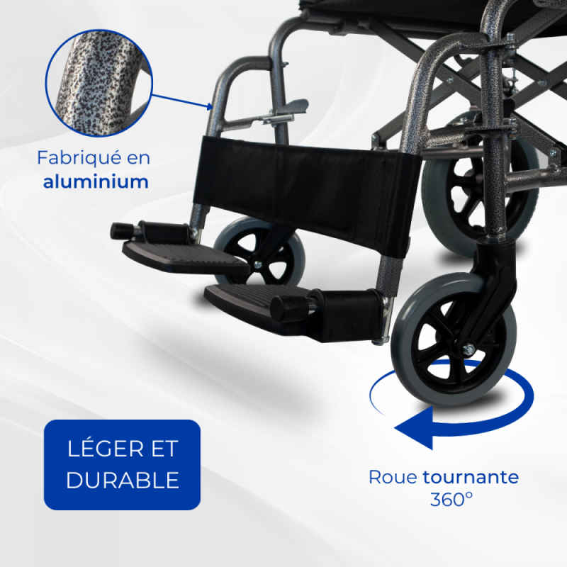 Ce fauteuil roulant pour personne âgée est fabriqué en aluminium haute résistance, ce qui lui confère robustesse et légèreté.